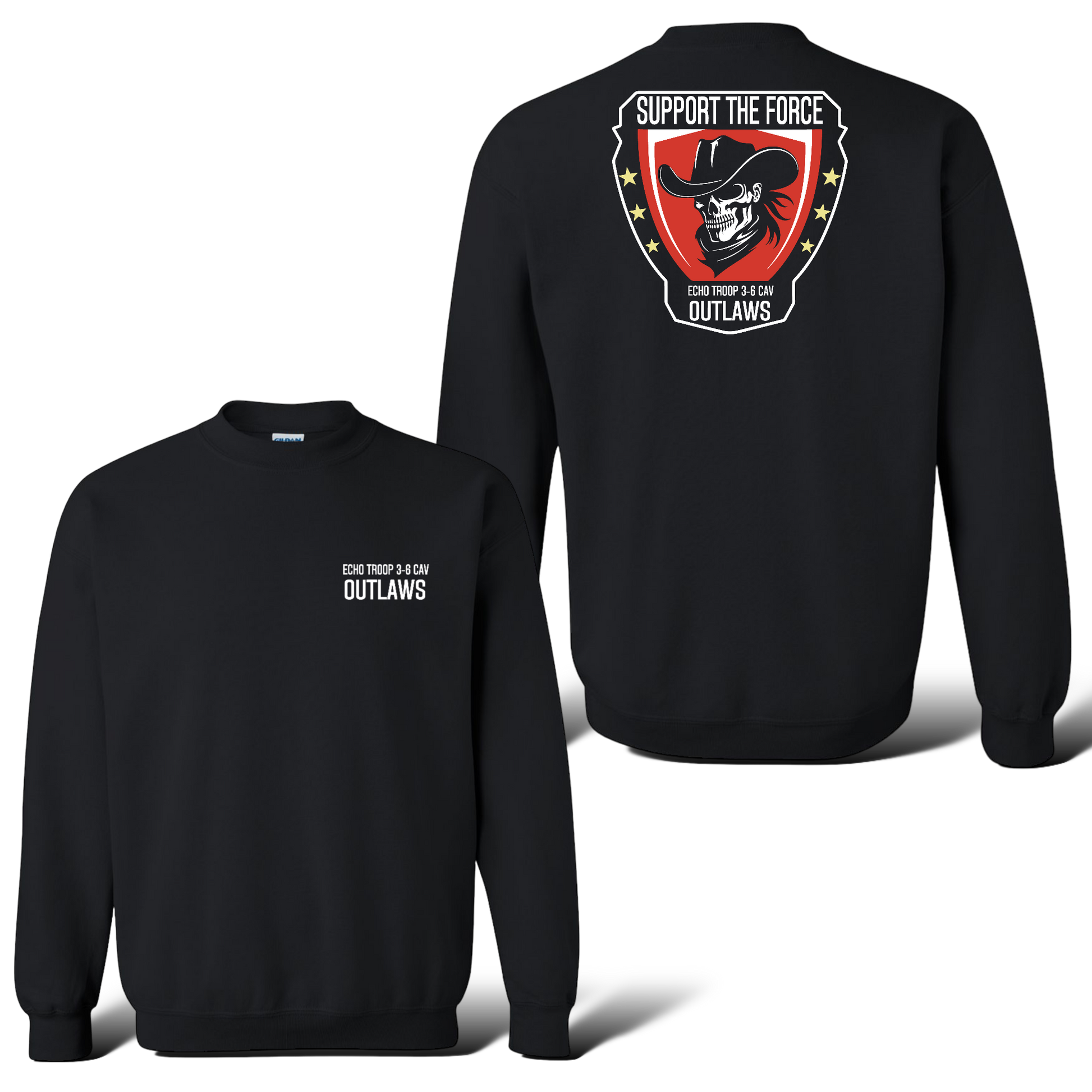 Level up your style with our E Troop 3-6 Cav Crewneck. Designed for strength and comfort, this 50/50 cotton/ polyester sweatshirt features the E Troop Outlaws logo on the back and E Troop 3-6 Cav Outlaws on the front. Available in black, this versatile sweater is perfect for everyday wear.